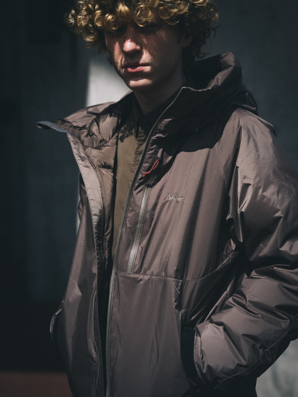 オーロラライトダウンジャケットの新型“ミカミ”は、レベル7の構造理論を投入したメイドインジャパンモデル。寝袋に用いられるボックスキルト構造を部分的に採用し、保温性を向 上させました。首元のベンチレーションなど、機能的で個性的なデザインは健在です。