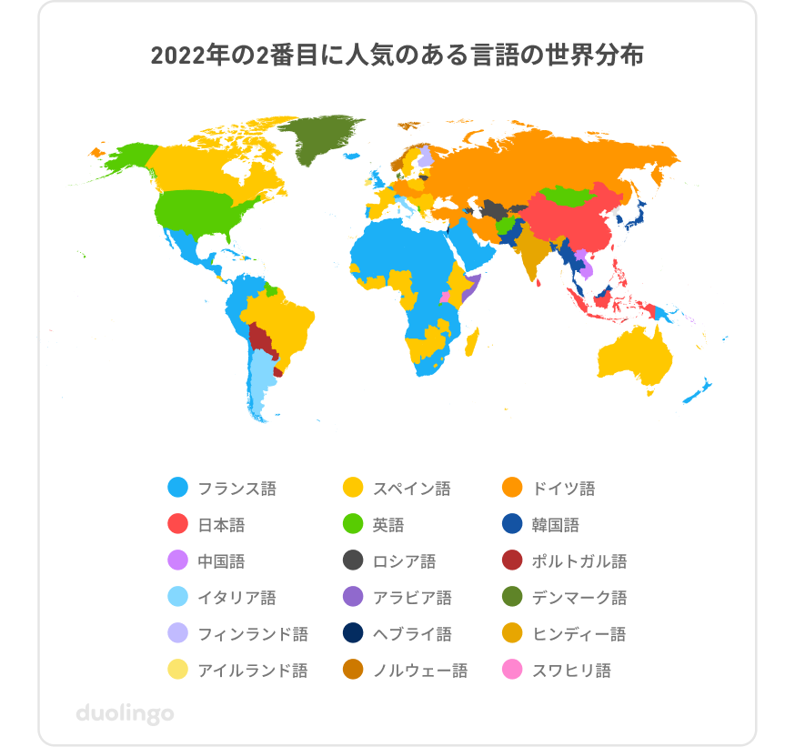 絶対数として学習者数の多い言語の1位は「英語」であり、2位以下は「スペイン語」、「フランス語」、「ドイツ語」と続きました。世界共通語の「英語」と公用語とする国が比較的多い言語が上位を占める中で、「日本語」は昨年同様に5位にランクインしました。日本以外ではほとんど使用する機会がない言語であるにも関わらず、日本語が上位にランクインしていることから、世界の日本の文化への関心の高さがうかがえます。下の2枚のマップ『2022年の最も人気のある言語の世界分布』と『2022年の2番目に人気のある言語の世界分布』から、中国、台湾、東南アジアの他に、ネパールやスリランカなどでも南アジア地域でも日本語が学ばれており、高い人気がうかがえます。