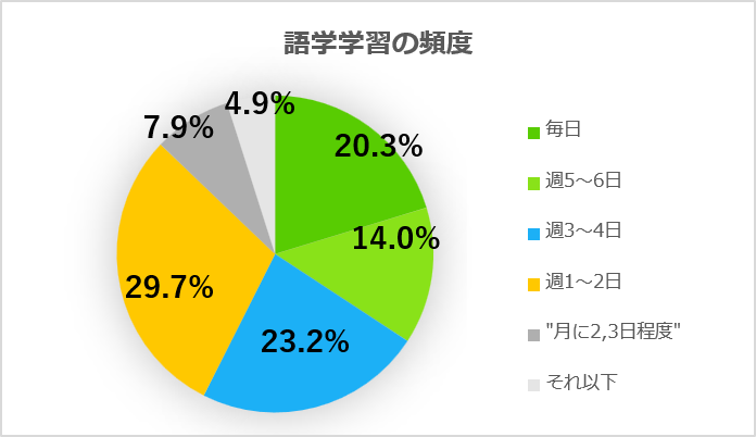 語学学習の頻度について質問したところ、最も多い回答は「週1~2日」 (29.7%) となりました。都道府県別の動向をみると、週の半分以上 (「毎日」「週5~6日」「週3~4日」の回答の合算) 勉強している人が多いのは「新潟県」となりました。新潟県では「毎日」を選択した回答者が30%と最も高くなっています。
