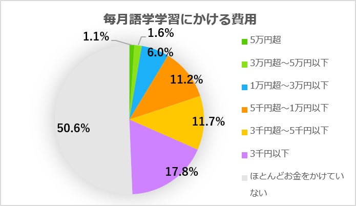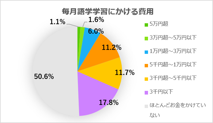 ◆語学学習にはほとんど費用をかけない人が過半数。動画、教本、アプリなど自分の時間でできる学習方法が