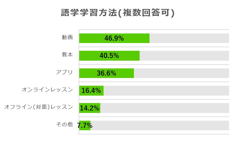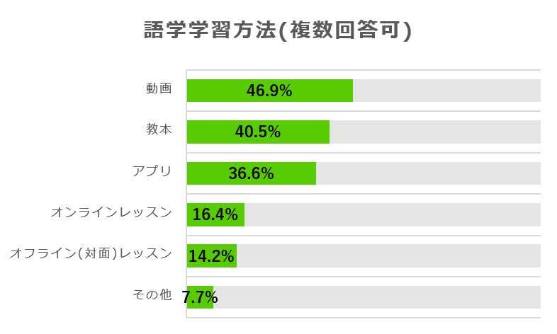 ● 語学学習費用はほとんどかけない人が過半数。「動画」、「教本」、「アプリ」と費用がかからず、自分のペースでできる学習方法が人気。