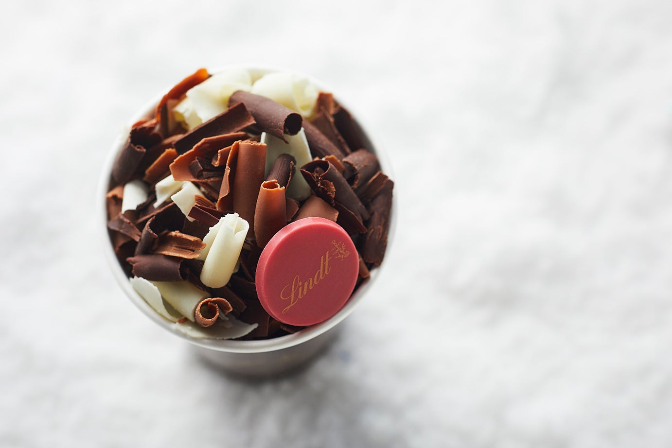 トッピングには舞い降りた雪をイメージし、70%ダーク、ミルク、ホワイトの3種のチョコレートを削ったチョコレートコポーをふんだんに使用。ドリンクに溶けていくことでさらに濃厚な味わいに変化していきます。また、クリスマスカラーのリンツロゴのチョコレートを添えることで見た目も華やかな印象に仕上げました。ドリンクとチョコレートコポーが溶け合ったこの季節にぴったりのショコラドリンクをぜひご堪能ください。