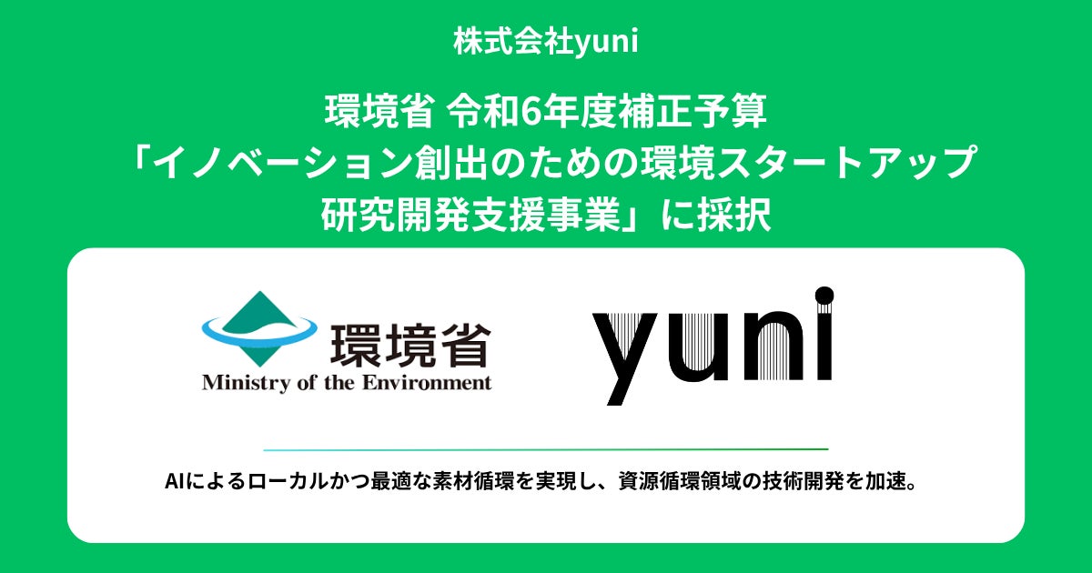 株式会社yuni(本社:東京都渋谷区、代表取締役CEO:内橋 堅志、以下「yuni」)は、環境省が実施する令和6年度(補正予算)環境保全研究費補助金「イノベーション創出のための環境スタートアップ研究開発支援事業」に採択されたことをお知らせいたします。