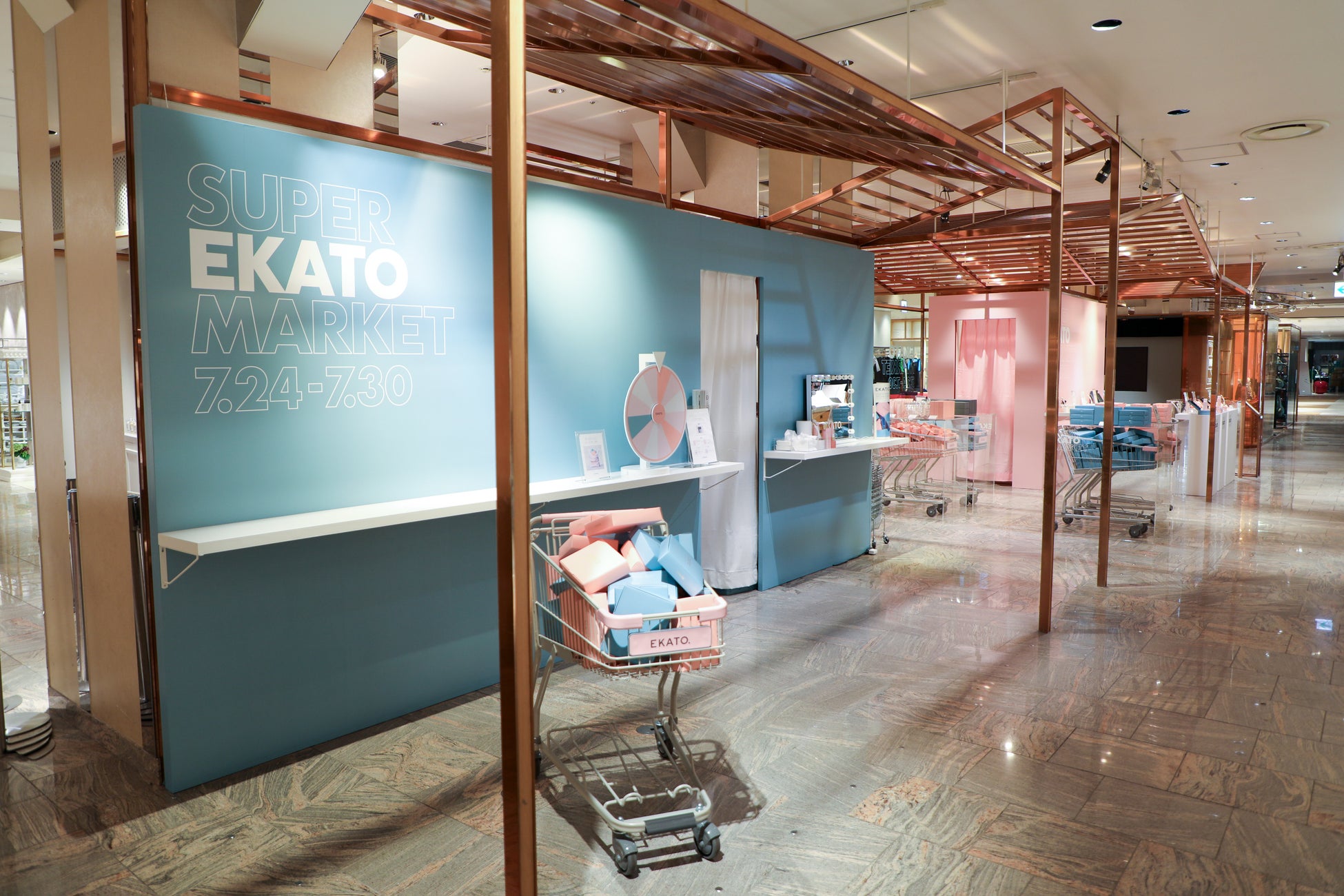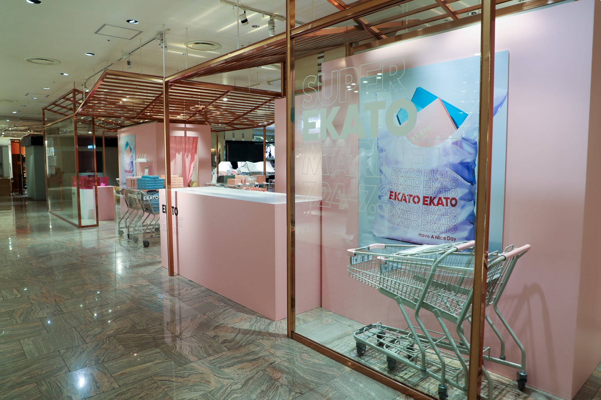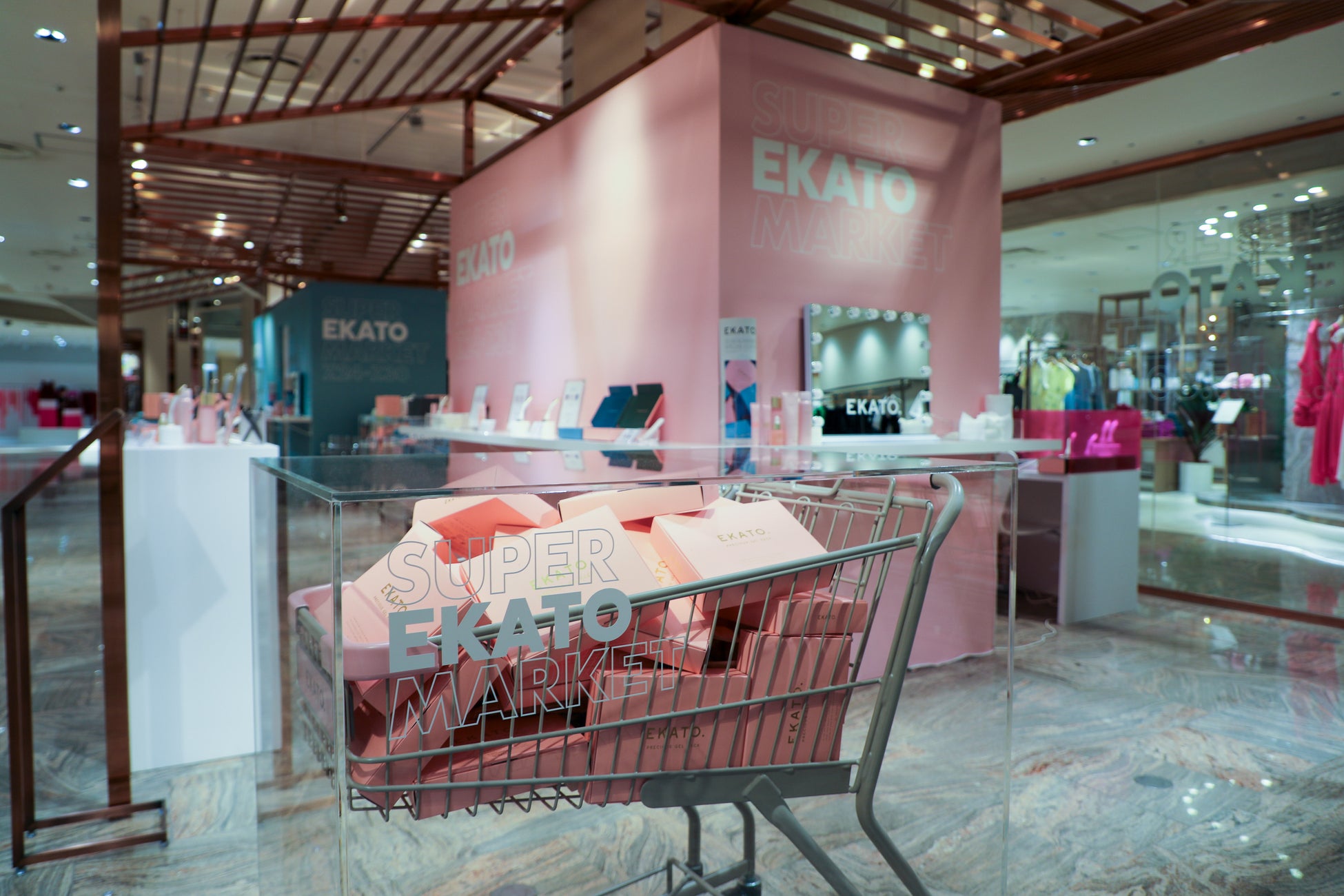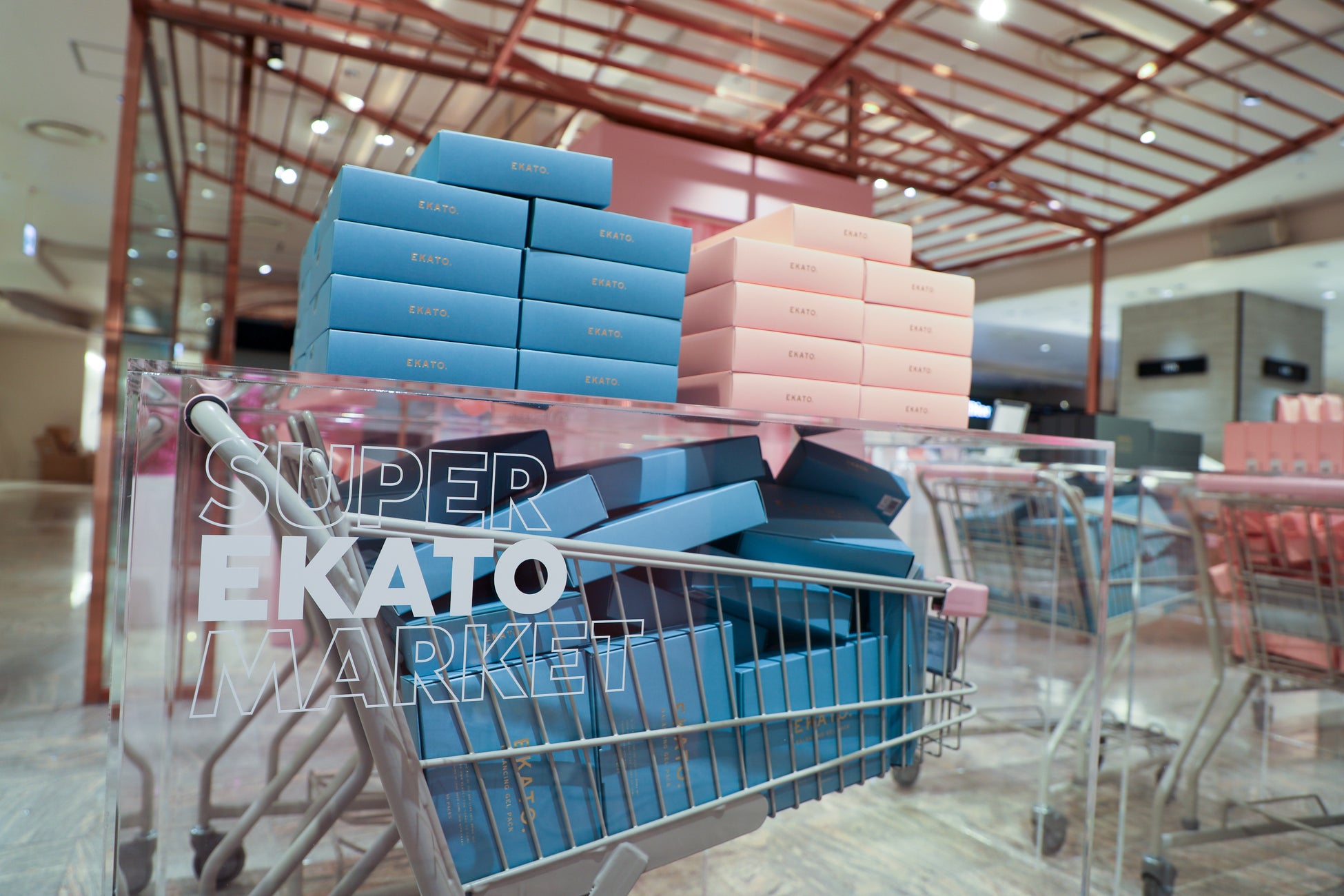 店内では"SUPER EKATO MARKET"と題したポップで楽しい空間に並んだ商品や、エカトグッズで溢れたショッピングカートのディスプレイボックスが注目を集めました。