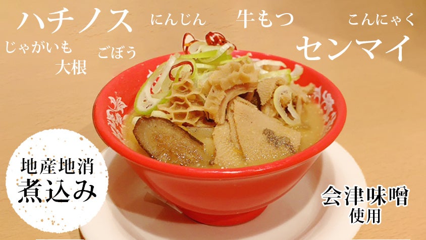 福島県の会津味噌を使った地産地消の煮込みとなっています。肉は郡山の精肉店から仕入れた希少部位のハチノスやセンマイなどを使用し、野菜も県内から仕入れた新鮮な地元食材をふんだんに使った料理となっています。