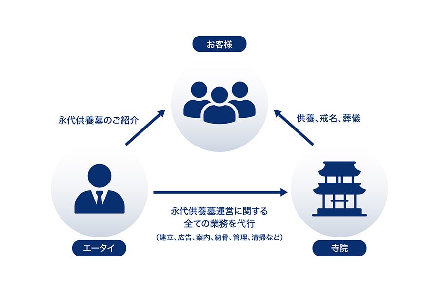 当社は「永代供養墓のリーディングカンパニー」として思いをともにする寺院と協力し、様々な考えから永代供養墓を選択する利用者と寺院を繋ぎ合わせることで社会に安心を提供しています。