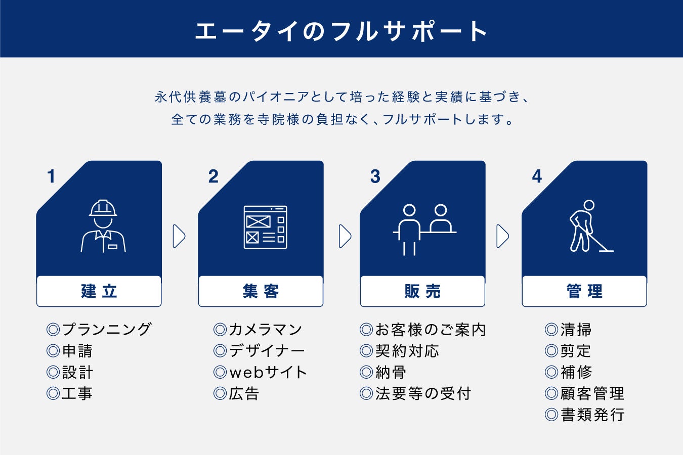 当社では、建立・集客・販売・管理といった永代供養墓運営に必要な全ての業務を、寺院の負担なくフルサポートします。