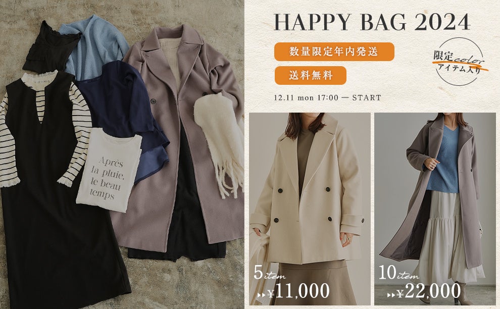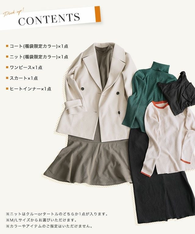 福袋限定カラーのコート・ニットを含む5点セットが¥11,000(税込)での販売となります。