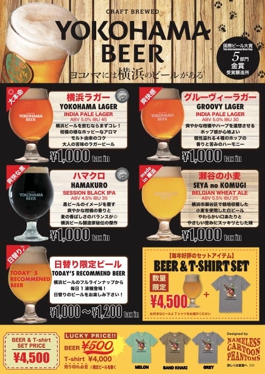 横浜を拠点に活躍するアーティストMoribe Makoto(https://ncpartwork.jimdofree.com/)が展開する物語「Nameless Cartoon Phantoms」とのコラボTシャツが昨年に引き続き発売決定!横浜ビールをイメージしたキャラクターYbeee(ワイヴィー)が描かれたTシャツです。