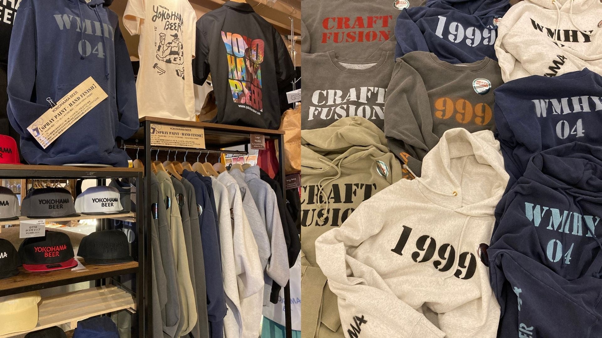 1枚1枚スプレーペイントによるこだわりの手仕上げで完成したフーディーとトレーナーです。