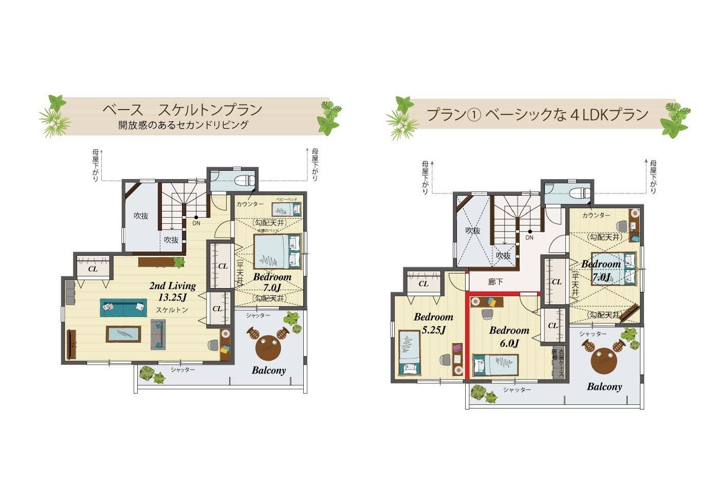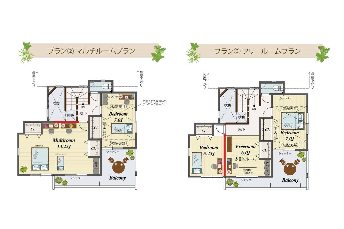 ベースのスケルトンプランからプライバシーを確保ができる4LDK(1)、廊下もまとめて広く使えるマルチルーム(2)、書斎やテレワーク、学習スペースなど多目的に利用できる3LDK+フリールーム(3)のプランが選択できます。ライフスタイルの変化に合わせてマルチルームから4LDK、フリールームへの変更ができ、「今」から、「将来」から、フレキシブルな間取りで対応可能です。