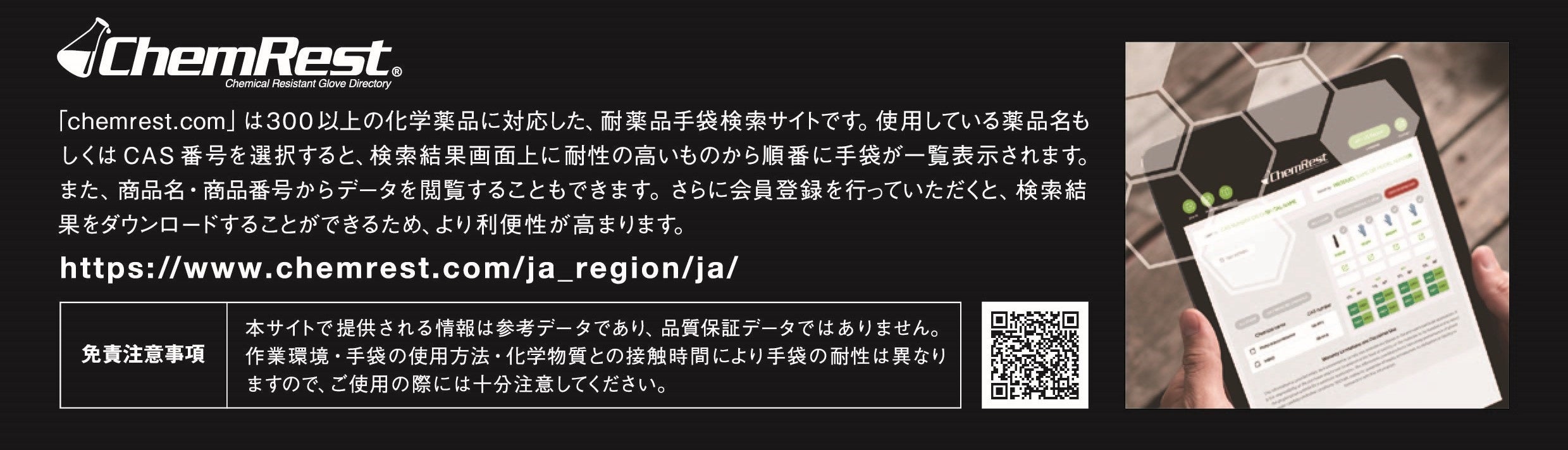※2:対応可能な薬品・溶剤は限られます。ご使用の前に手袋の耐薬品性に関する情報を参照した上で使用可否をご確認ください。ご使用の前には必ず手袋にキズ・ピンホール・破れ等ないか、よく確かめてください。手袋皮膜の亀裂により薬品や溶剤が浸透したり、透過が早まるおそれがあります。