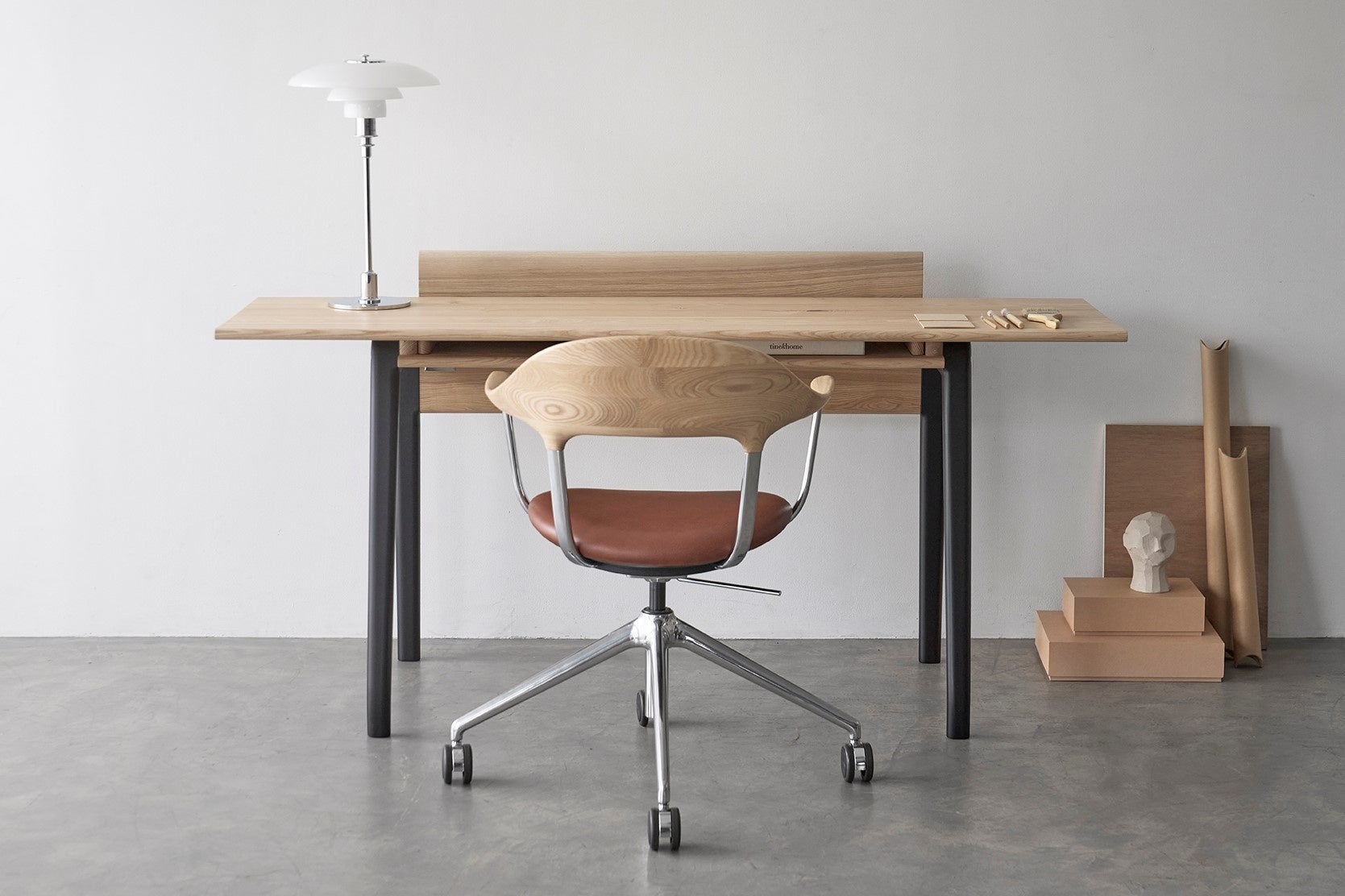 そこで、私たちはこれらの課題を解決できるデスクデザインの議論をチェアの開発と並行して重ねてきました。結果導き出したのは、デスク上に広がった書類やガジェットを整理しリセットする収納を持ち、リビング・ダイニングにある他の家具との間で不協和音を生み出す重たい存在にならないデザイン。手に馴染み長くともに過ごしたい温もりのある素材を使うこととFOURチェアを受け止める美しさがあることも大切にしました。