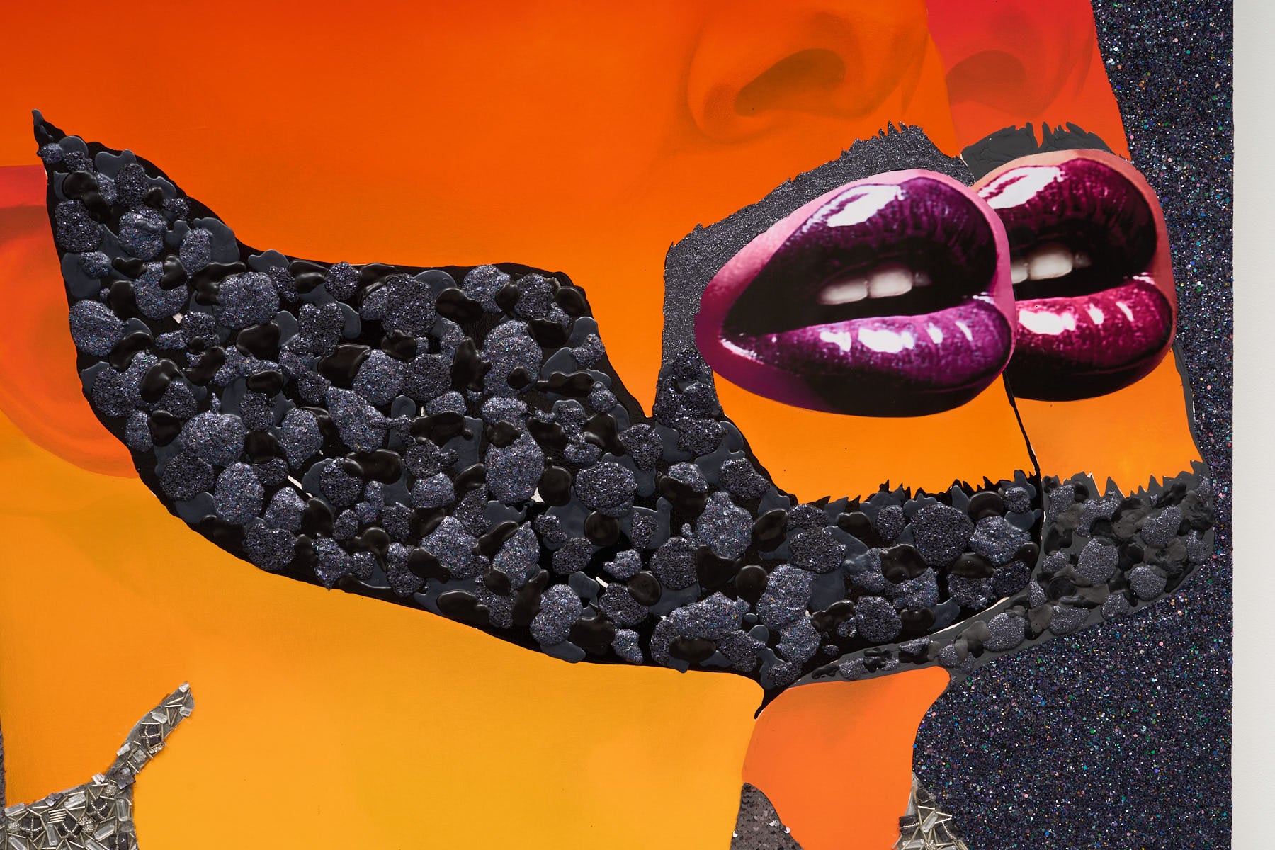 グリッターやラインストーンといったドラッグ・カルチャーの素材を用いて、自身が持つフェミニニティを象徴するデヴァン・シモヤマは、友人のアンソニー(Anthony)を二重にして描いた「Anthony Doubled」で、彼ら自身のクィアネスや、アイデンティティの複層性を示します。もう一点の展示作品、「From The Night」は「花を贈る」という、普遍的かつロマンティックでありながら、その行為によって生じる約束、そしてそれを信じ続けることについて考察する作品だと言います。シモヤマが用いるグリッターという素材は、鑑賞者の動きに応じて輝きを放ちます。これは一回性の鑑賞体験を与えるものと言えるでしょう。