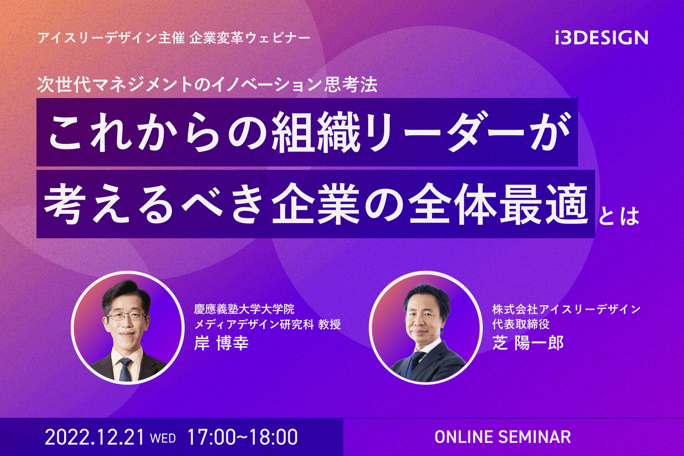 株式会社アイスリーデザイン(本社:東京都渋谷区、代表取締役:芝 陽一郎、以下:アイスリーデザイン)は、慶応義塾大学大学院 メディアデザイン研究科 教授 岸 博幸氏と共同で、「次世代マネジメントのイノベーション思考法〜これからの組織リーダーが考えるべき企業の全体最適とは〜」をテーマに2022年12月21日(水)17時よりオンラインセミナーを開催いたします。