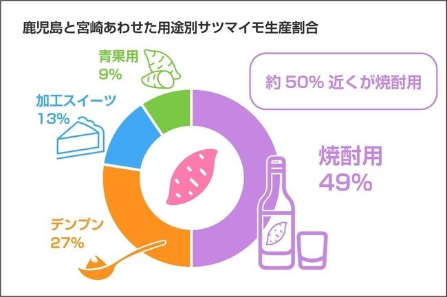 現在、サツマイモ市場は、深刻な病気・基腐病(もとぐされびょう)により、南九州を中心に大きな被害を受けています(鹿児島と宮崎を合わせた生産量は全国の半分近くを占めています)。特に深刻なのは、焼酎用に栽培されたサツマイモです。鹿児島県では、生産量にして約15万トン、全体の約47%もの焼酎用サツマイモが失われました。これは、焼酎メーカーの生産量ベースで3,500万本、売上高ベース換算で約300億円もの市場が失われたことになり、一部商品はすでに販売停止に追い込まれています。