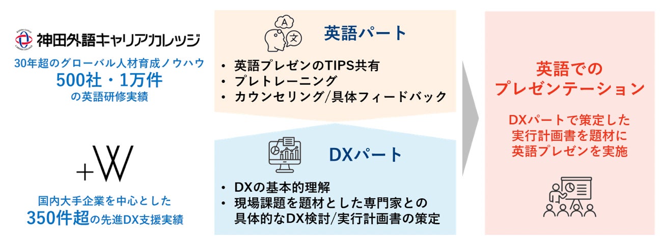 Plus W株式会社(本社:東京都渋谷区、代表取締役社長:櫻井稚子、以下「Plus W」)は、神田外語キャリアカレッジ(本社:東京都千代田区、代表:仲 栄司、以下「キャリアカレッジ」)とともにグローバルにDXを推進していく次世代リーダー人材を育成するため、実戦で活躍するプロフェッショナルが講師となり、DXと英語を同時に教育する『 DX×英語 未来型グローバルリーダー育成プログラム』を11月より開始いたします。