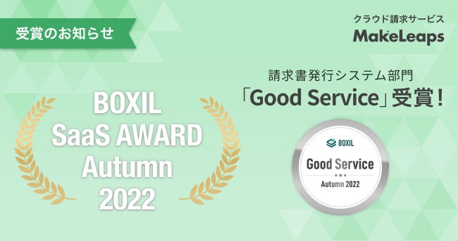 リコーグループのメイクリープス株式会社(本社:東京都目黒区、代表取締役社長:児玉哲、以下メイクリープス)が提供するクラウド型請求管理サービス『MakeLeaps(メイクリープス)』は、スマートキャンプ株式会社(以下「スマートキャンプ」)が今最も評価されているSaaS(※1)を表彰する「BOXIL SaaS AWARD Autumn 2022」請求書発行システム部門で「Good Service」に選出されたことをお知らせします。