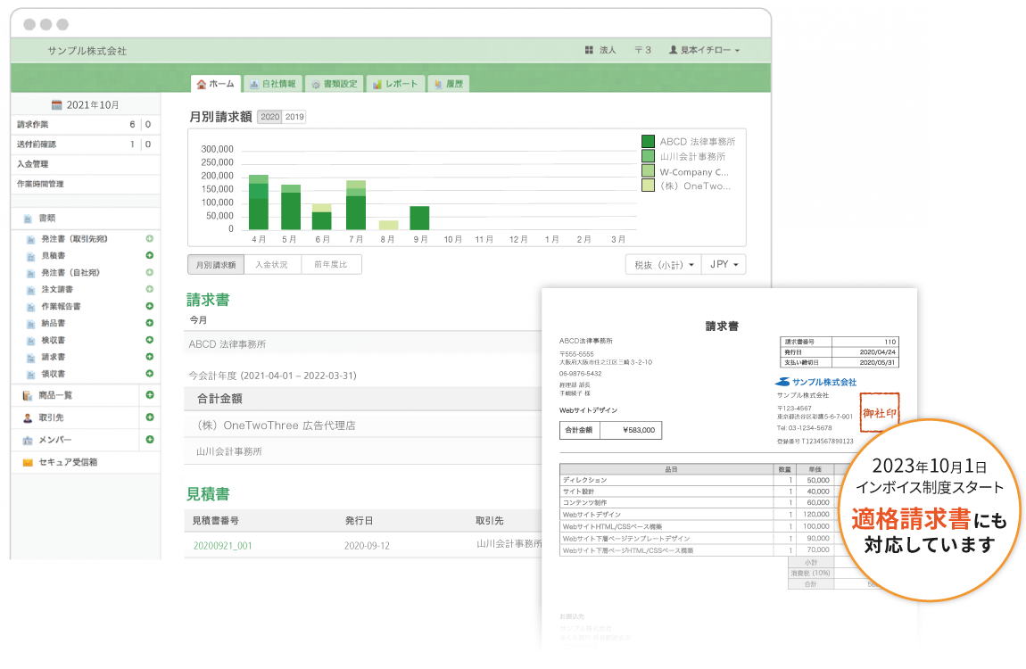 クラウド上で簡単に見積書や請求書をはじめとする書類を作成でき、承認、郵送代行や電子送付、入金管理や売上レポートの表示ができる請求管理サービスです。2011年製品リリース以降、個人事業主から中堅企業まで幅広い企業様にご利用いただいています。また、2018年11月には株式会社リコーの100%子会社となり、リコーグループ内で製品機能の共同開発ならびに販売を強化することで機能開発・販売促進を進めてまいりました。