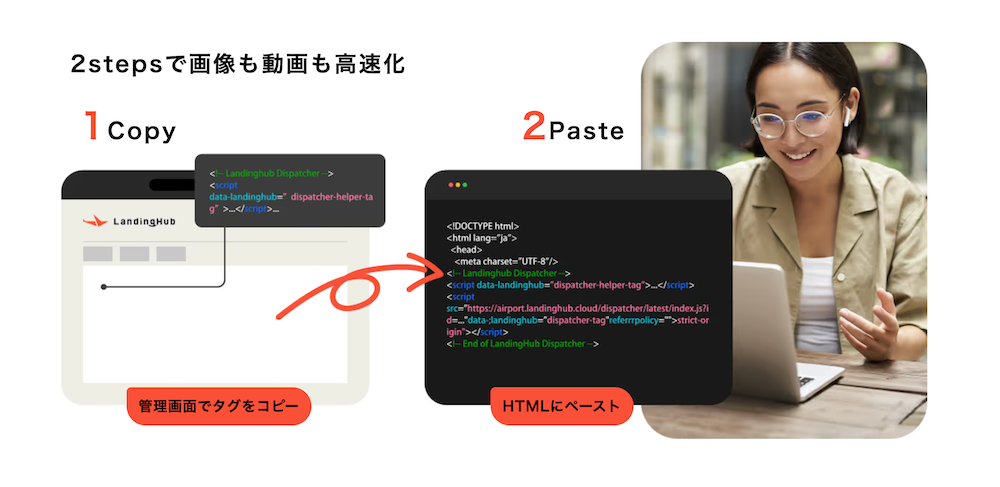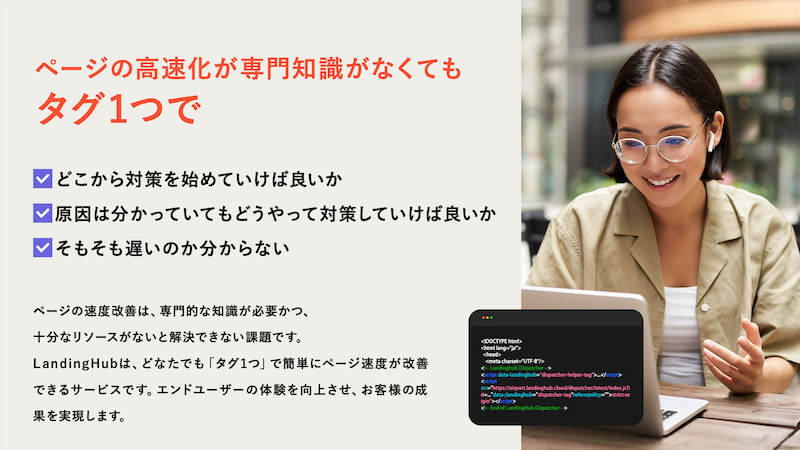 LandingHubとは、タグをHTMLに設置するだけで、LPやWebページが高速化されるサービスです。