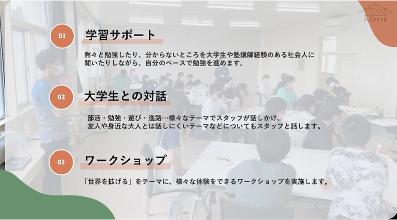 "町内に塾が無いので、長期休暇期間中だけでも勉強のサポートをして欲しい。"