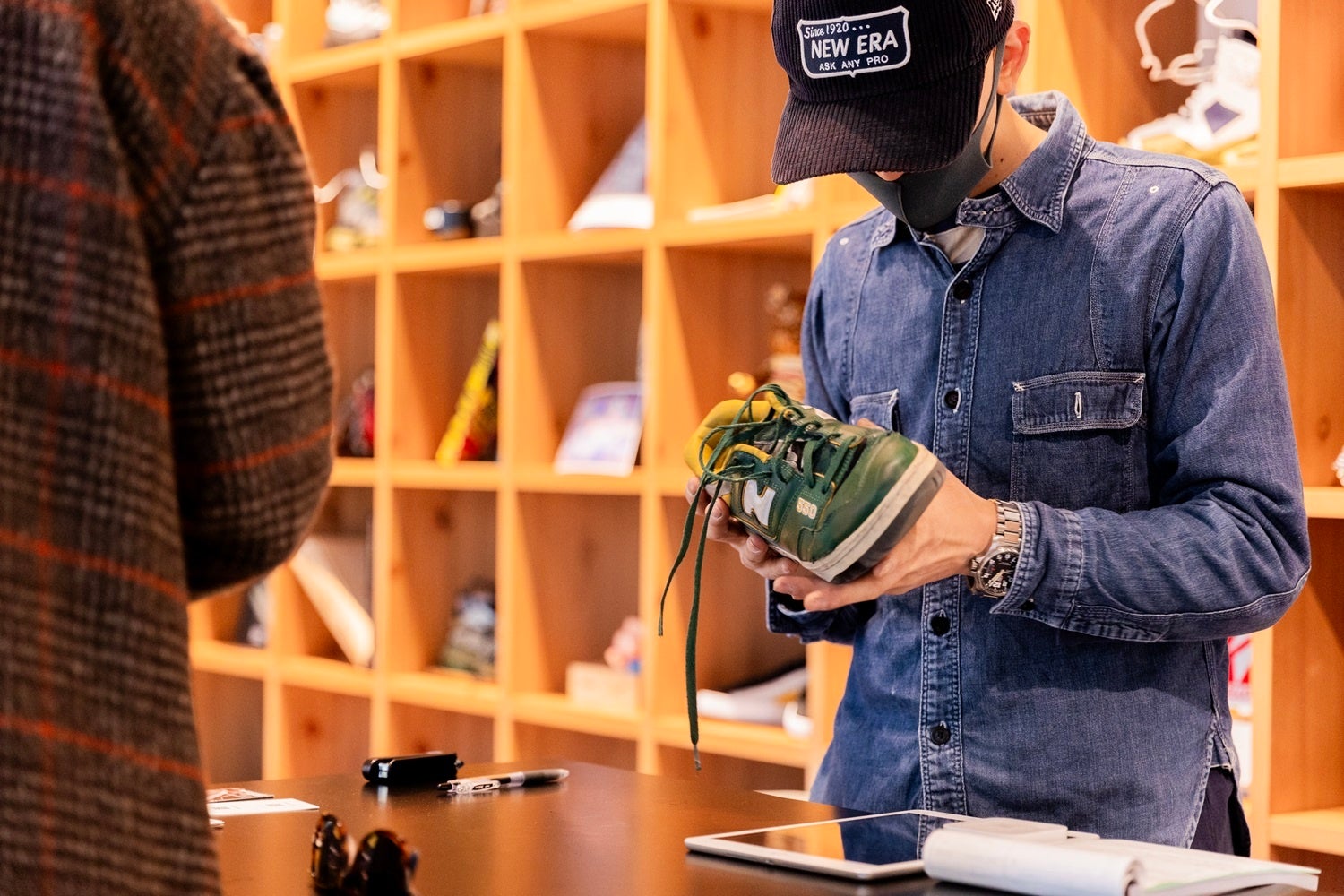 今回は、東京のスニーカーカルチャーを牽引しアイコニックなスニーカーショップとして、世界に向けて発信している「atmos(アトモス)」と初めてコラボレーションをし、日本のスニーカーストーリーを発信していくコンセプトストア「atmos 千駄ヶ谷店」にてPOP-UPを開催しました。 「Vibram SHOES REPAIR POP-UP」のメインコンテンツとしているシューズのリペア・カスタマイズオーダーは、今回に限り“スニーカー”を対象として実施。靴の知識と経験豊かな専門の職人がブースに立ち、お客様とのカウンセリングを行いました。お客様の想いがこもったスニーカーが職人の手に委ねられ、『どんな風に生まれ変わらせたいか?』などをヒアリングしながら、Vibramのソール各種の特長や相性なども踏まえ最適な組み合わせをご提案しました。毎シーズン100モデル以上のアウトソールを開発するVibram。POP-UP期間中は選りすぐりのほんの一部のソール展示やご提案となりましたが、お客様からは『こんなにソールの種類があるんですね』『スニーカーにもVibramをつけられるんだ!』『ずっとスニーカーのリペアをしたかった』などといった声が多く寄せられ、今回もリペアオーダーは多くのお申込みをいただき大好評となりました。