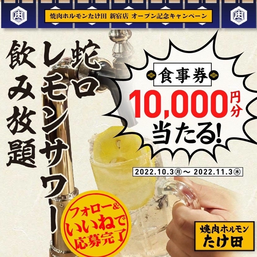 東京の繁華街 新宿店&中野店『焼肉ホルモンたけ田』が2022年10月13日(木)2店舗同時オープン!【新宿店限定】オープンキャンペーン 蛇口レモンサワー飲み放題が驚愕の29円