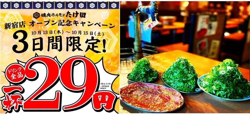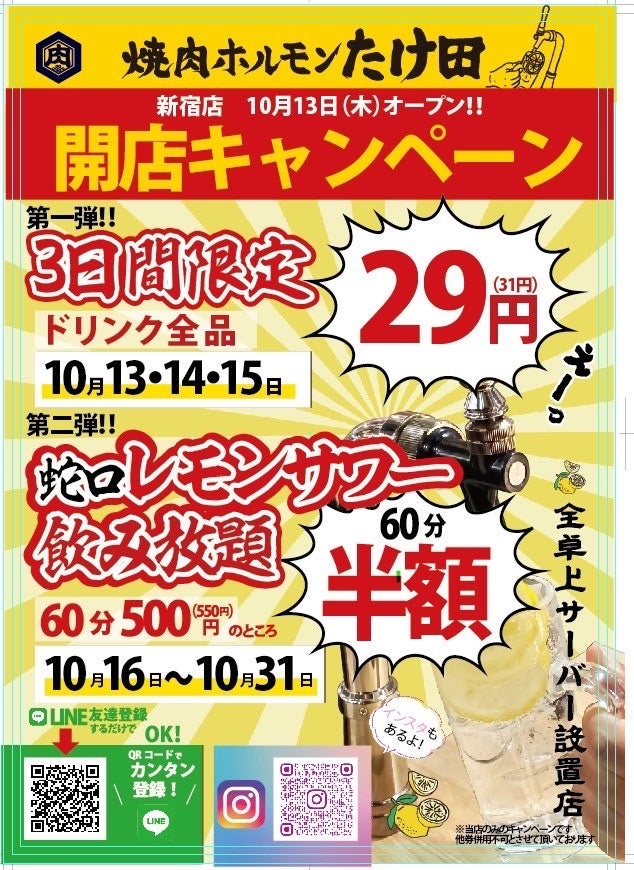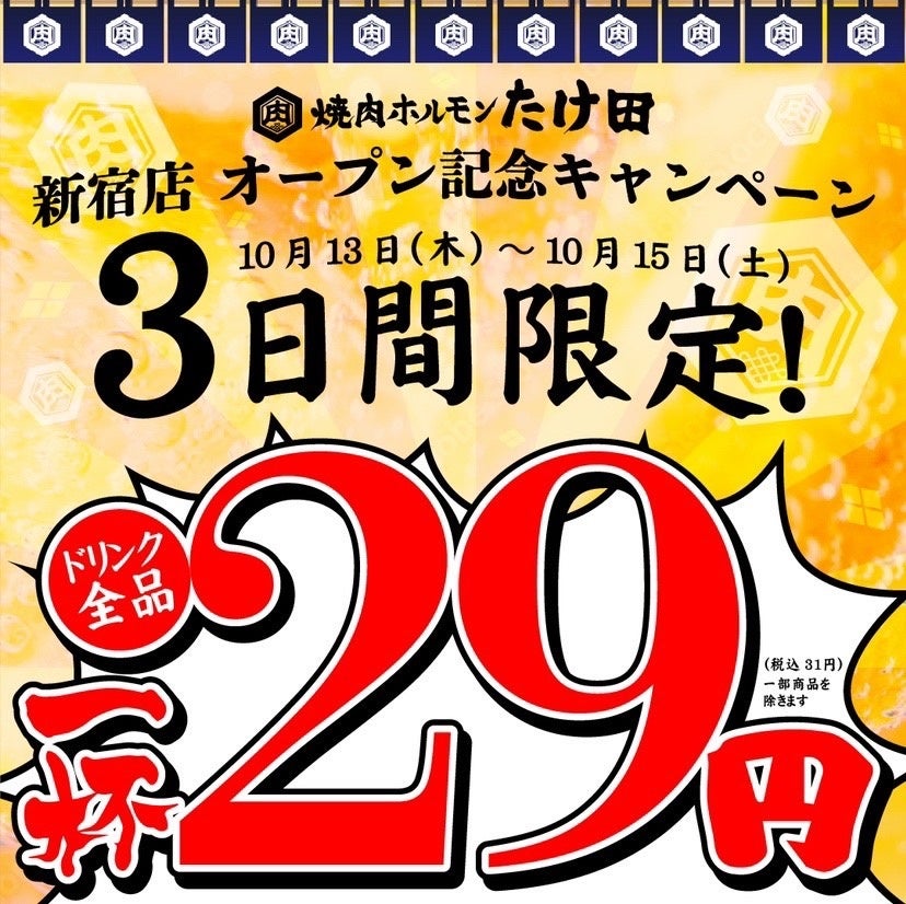 この度『焼肉ホルモンたけ田』は、飲食最大の繁華街である新宿店を出店する運びとなりました。出店を記念して、蛇口レモンサワー&全てのドリンクを、オープンから3日間限定で29円(税込)とう驚愕のプライスでご提供いたします。