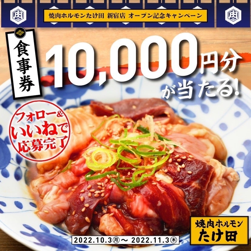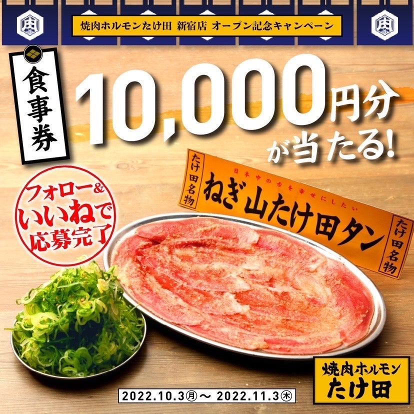 焼肉ホルモンたけ田 新宿店 公式インスタグラムのアカウントフォロー&投稿にいいね、をしていただいた方から3名に1万円の『焼肉ホルモン たけ田』のお食事券プレゼントいたします。