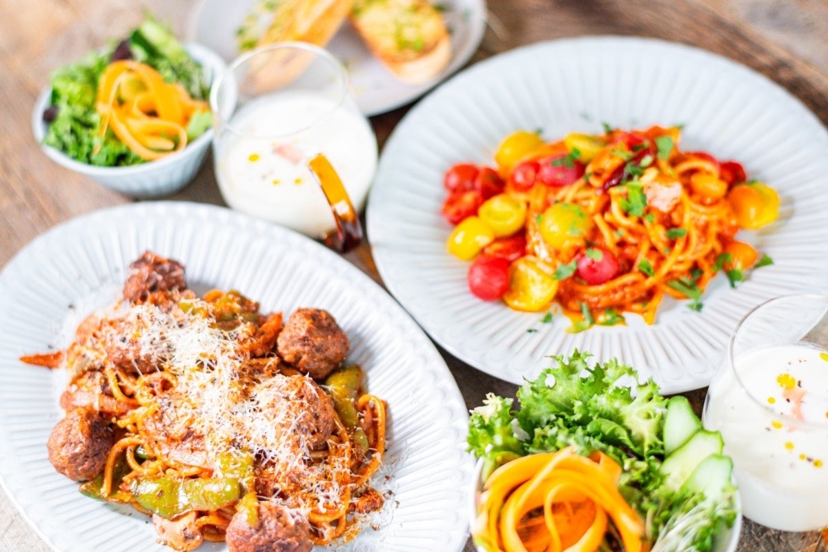 ランチタイムは、6種のスパゲッティからお好きなものを選べる、全6種のコース形式のお得な「ランチセット」や、野菜がたっぷり摂れる「ふわとろオムライスハンバーグ」や「ミートボールなミートソーススパゲッティ」など、性別・年代問わずご利用頂けるメニューを取り揃えております。午後は、アフタヌーンティーをイメージしたデザートプレートをはじめとするパティシエ手作りのバスクチーズケーキ、グラスパフェ、フルーツだけで作るジェラートなどの自家製スイーツとコーヒーや紅茶でカフェタイム。“飲めるパンケーキ”と呼べるような驚きのメニューもご用意しています。スイーツはテイクアウトもできます。