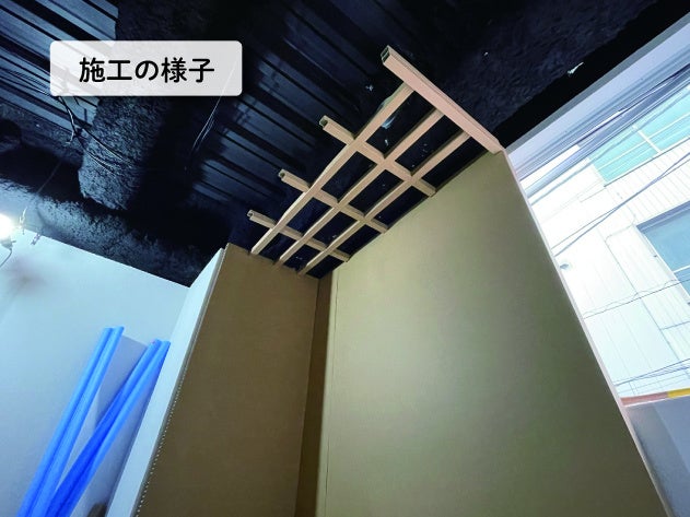 2)レストルーム施工の様子です。天井は角紙管を格子状に組み合わせたデザインとなっています。