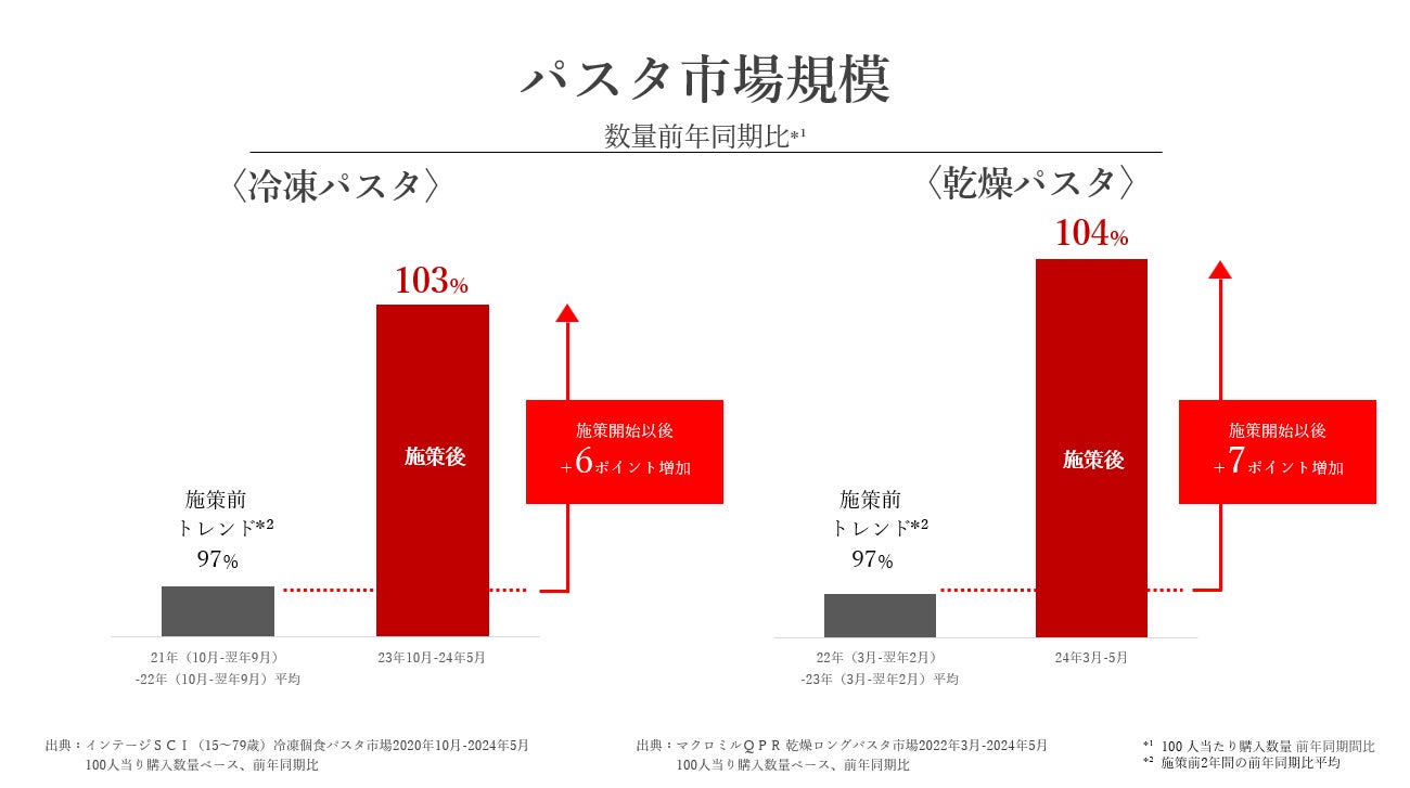 マーケティング戦略と組織改革を本気で実行した結果、2023年10月の施策開始以降、前年同期比で、オーマイプレミアムの冷凍パスタが 120%※伸長 。 乾燥パスタは、今年3月に発売した新商品「もちっとおいしいスパゲッティ」の導入で前年同期比116%※と大きく成長し、僅か2ヵ月で1,000万食を超える販売数量に到達。シェアの伸び率も施策前に比べ前年比において冷凍パスタで+29ポイント、乾燥パスタで+32ポイントと大幅に伸長。同時にコロナ後に停滞していた 家庭用パスタ市場規模についても冷凍パスタで+6ポイント、乾燥パスタで+7ポイント拡大し、市場を活性化させていると説明しました。そして、今後も強化したマーケティング組織で、より市場を活性化させながら、オーマイプレミアムブランド(冷凍パスタ・乾燥パスタ)としても本年度の売上目標120億円を目指し継続成長していきたい、という将来展望を共有しました。
