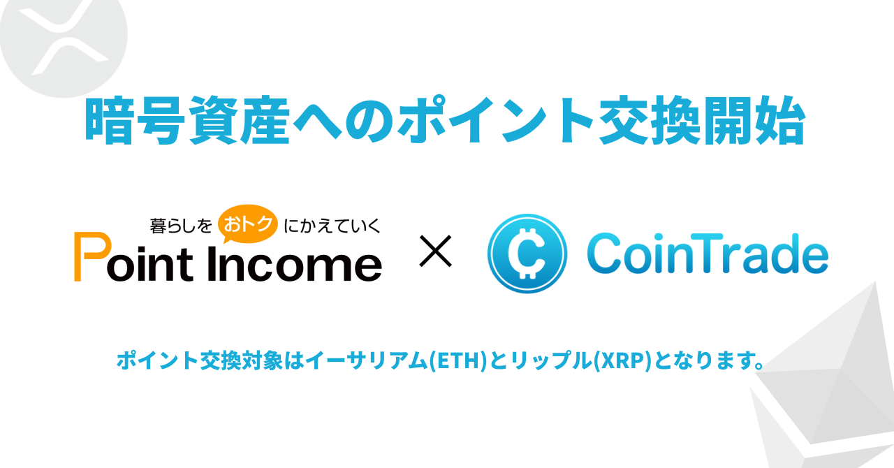 「CoinTrade」と「ポイントインカム」がポイント交換で提携イーサリアム(ETH)とリップル(XRP)へポイント交換開始