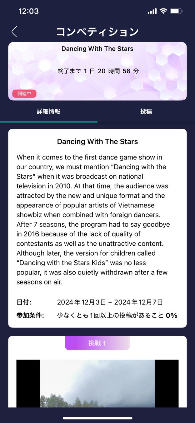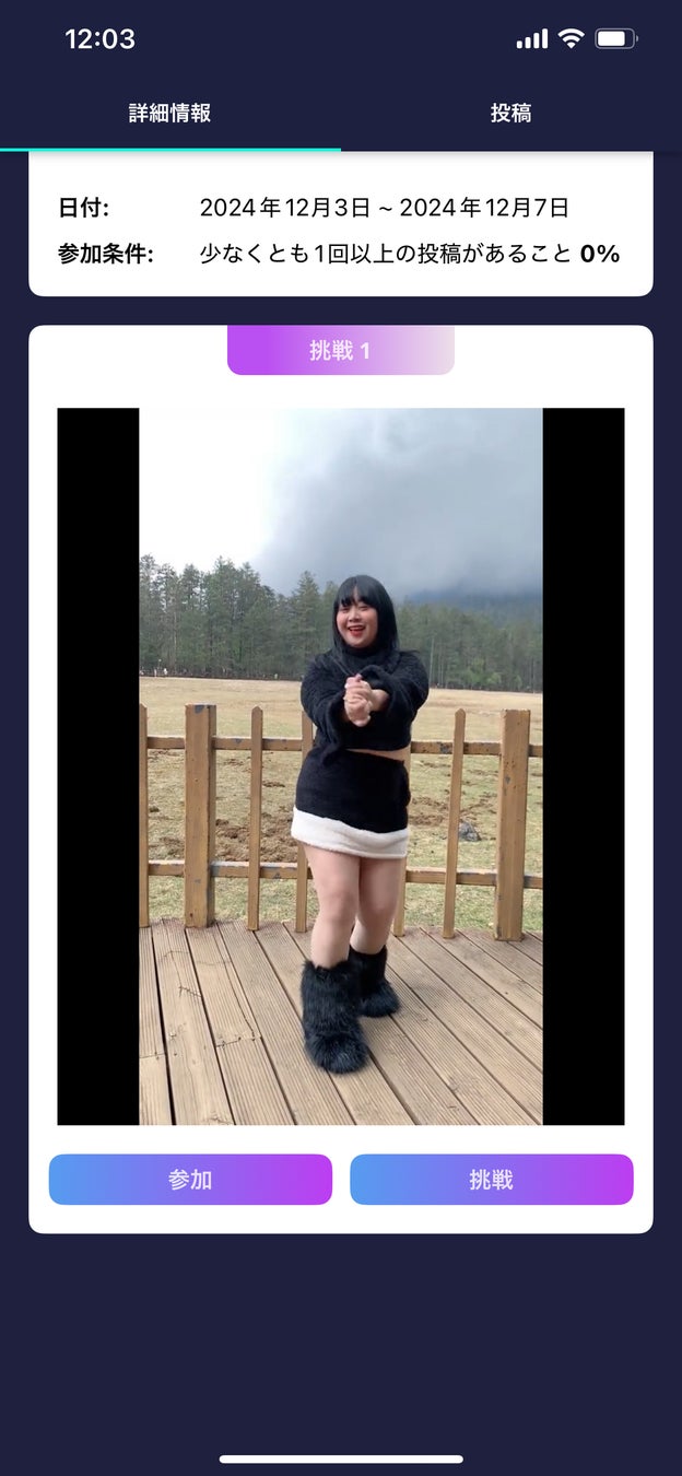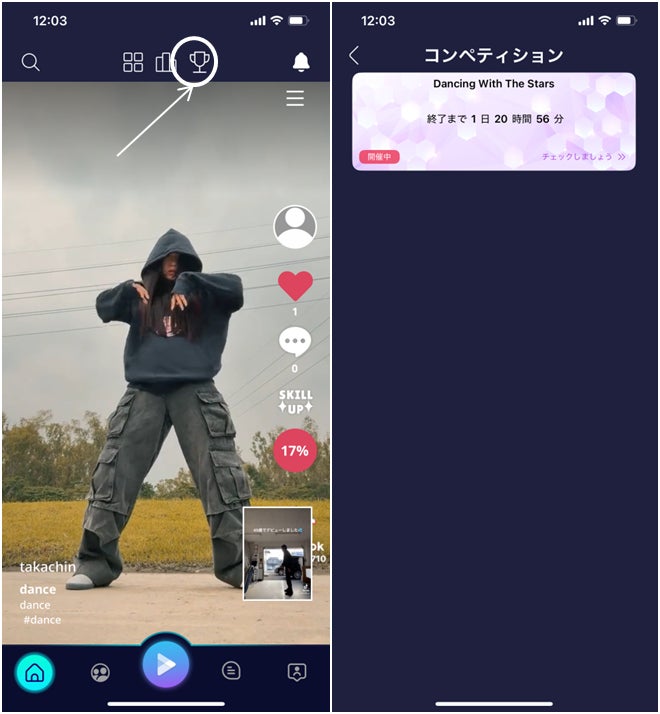 「挑戦」では、指定された課題に取り組むことができます。また、「参加」では、大会に自分のダンス動画を投稿して参加します。