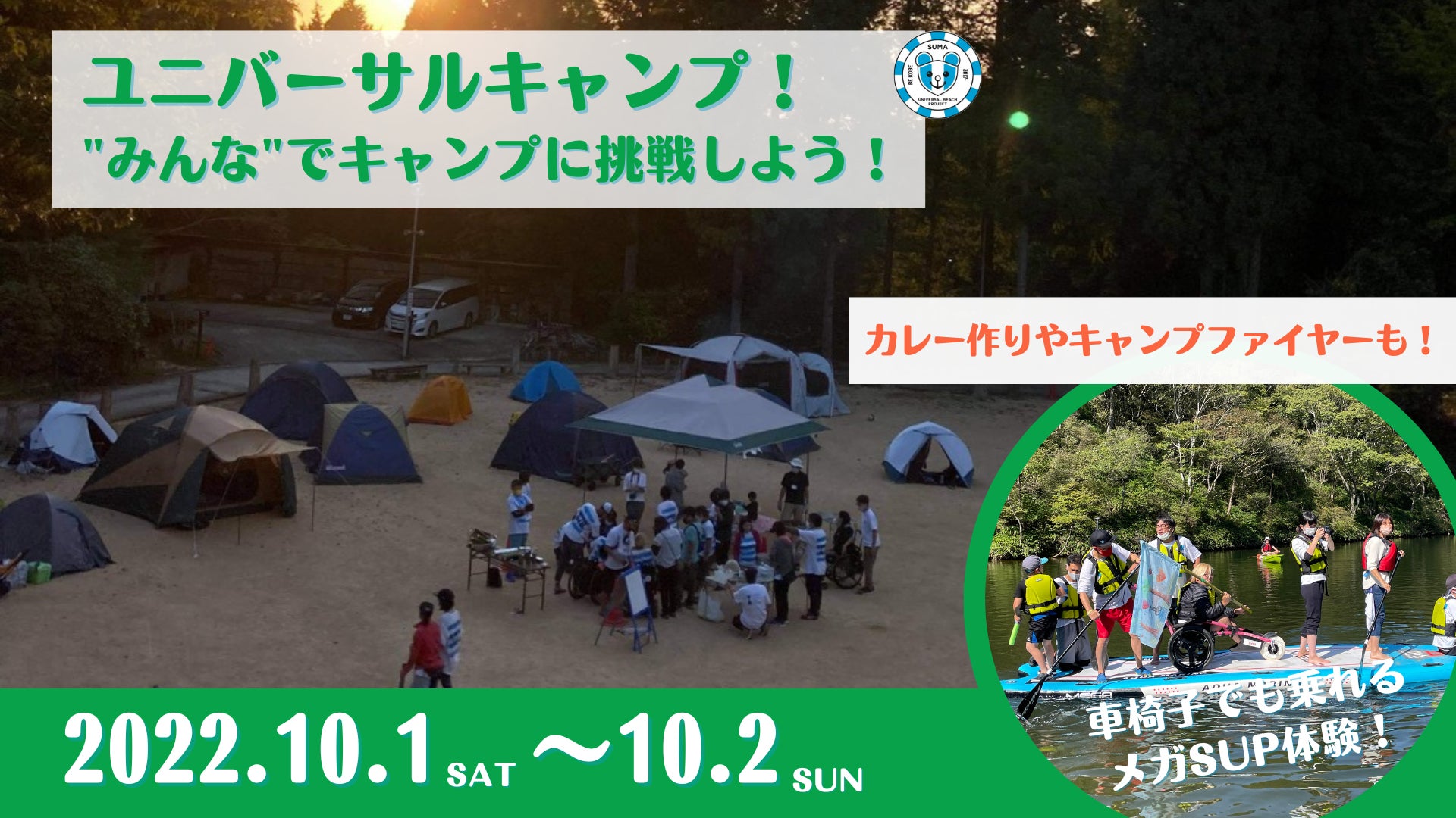 障がいがある人もない人もみんなが一緒に楽しめるビーチづくりを目指すNPO法人須磨ユニバーサルビーチプロジェクトは、10月1日(土)11:30 ~10月2日(日)11:30 神戸市立自然の家にて、車椅子の方もそのご家族も”みんな”で自然の中でキャンプができるユニバーサルキャンプを開催します。