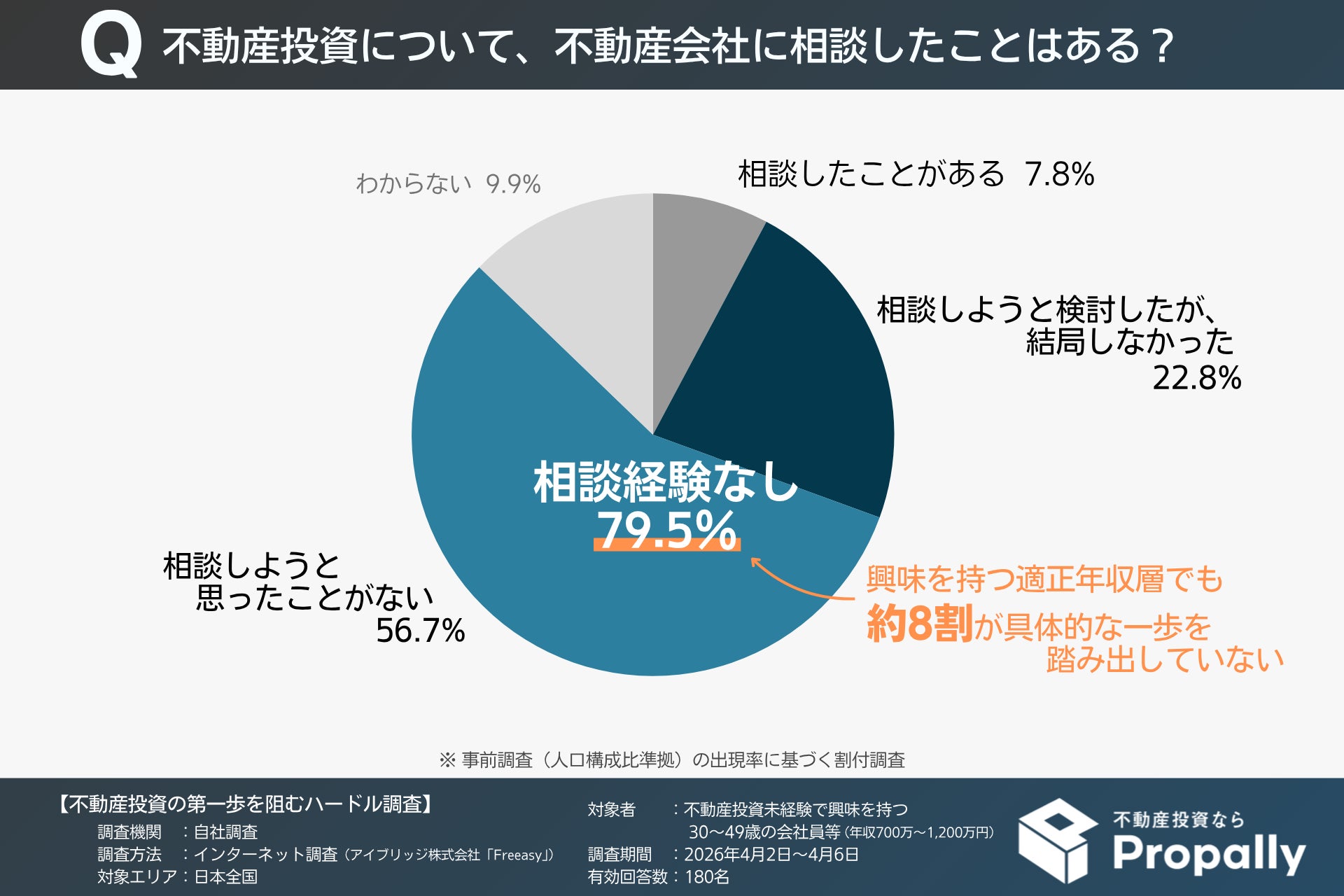 不動産投資プラットフォームの開発・運営を行うPropally株式会社( https://propally.co.jp/ )(本社:東京都港区、代表:齊藤郁織)は、不動産投資への第一歩を阻むハードルを明らかにするため、不動産投資未経験で興味を持つ30歳~49歳の会社員等(年収700万~1,200万円)を対象にアンケートを行いました。本調査からは、不動産投資に適した層の多くが不動産会社との接点を持っていない現状と、これから求められるサポートのあり方が見えてきました。