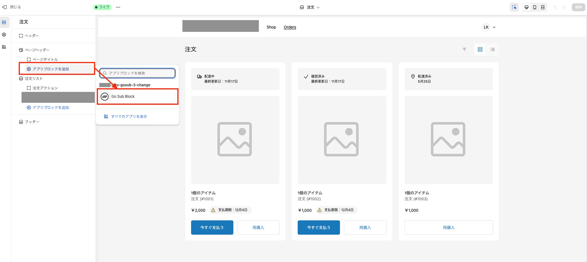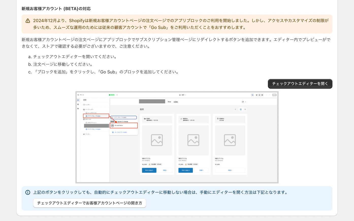 ※ チェックアウトエディター内でアプリブロックやサブスクリプションページのプレビューができず、アプリブロックを追加いただいていても表示がされません。