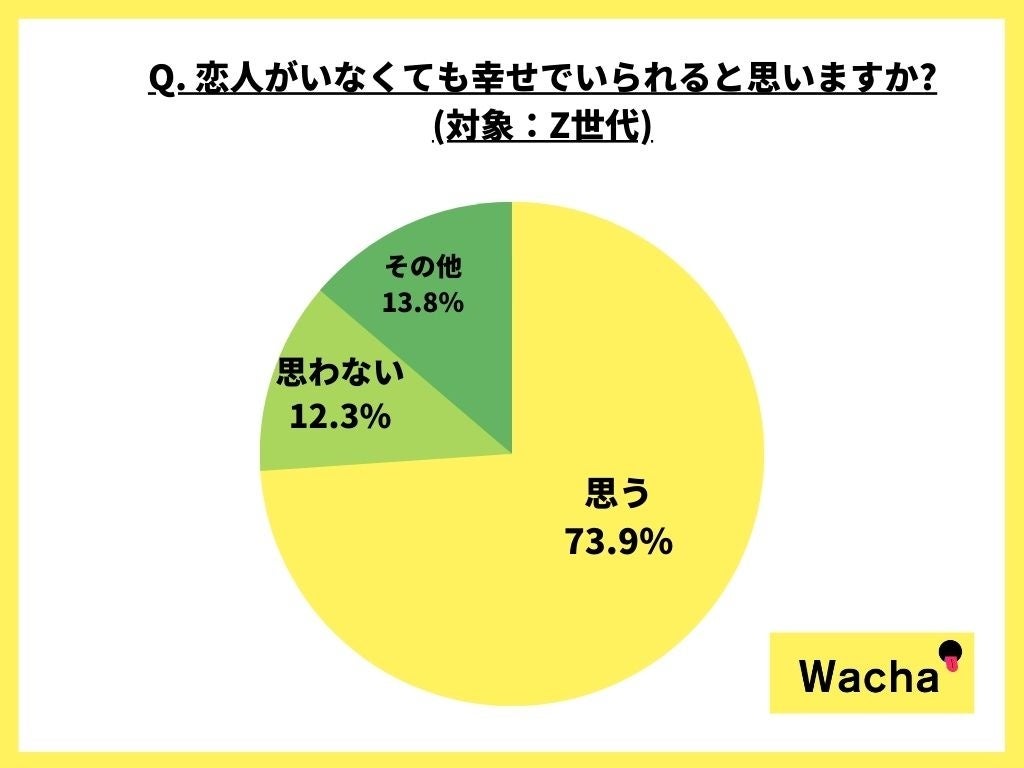 70%以上が「クリスマスに恋人やパートナーは必要だと思わない」と回答したZ世代でしたが、「恋人がいなくても幸せでいられると思いますか?」という質問に「思う」と回答した人の総数は73.9%、「思わない」と回答した人の総数は12.3%で、Z世代はあまり恋人やパートナーという存在に執着していないことがわかりました。