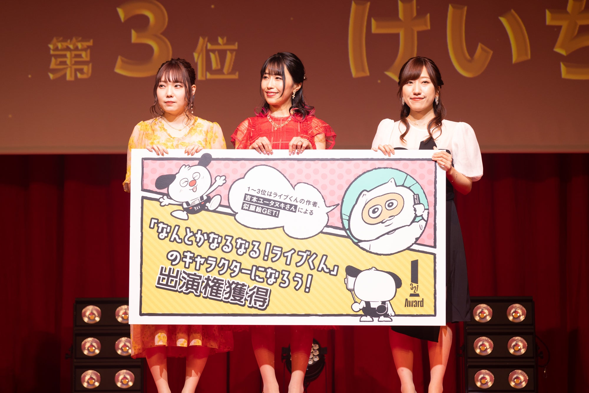 321公式キャラクター「ライブくん」の作者・吉本ユータヌキさんによるライブくんとのツーショット似顔絵GETを目指したイベントで入賞した上位3名がステージへ登場。