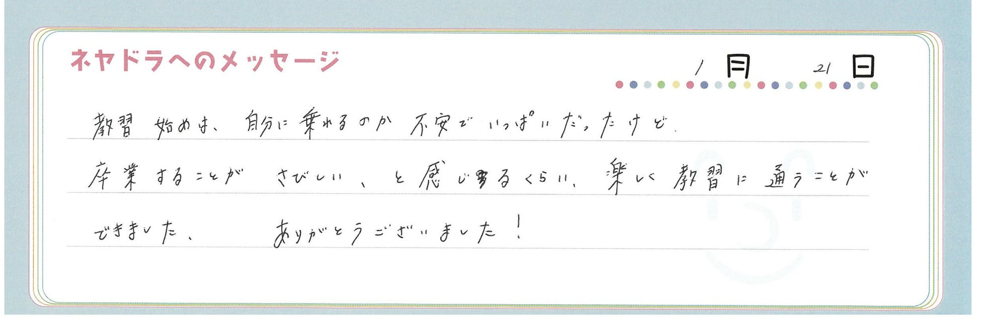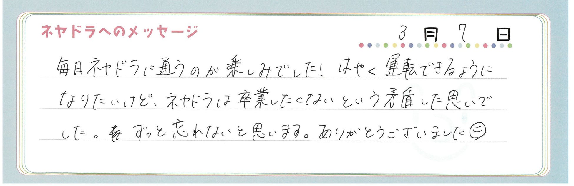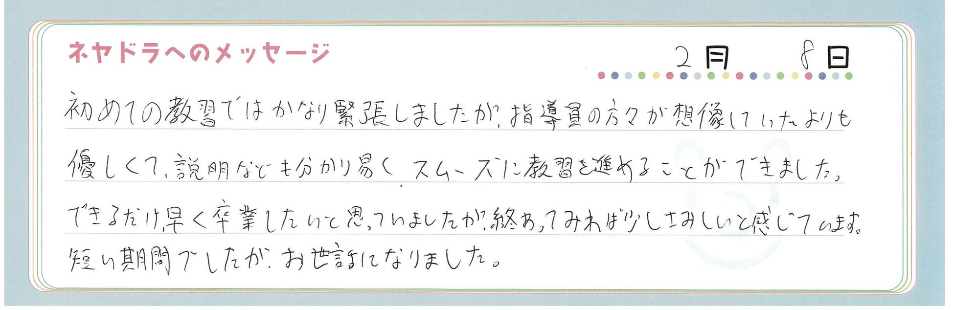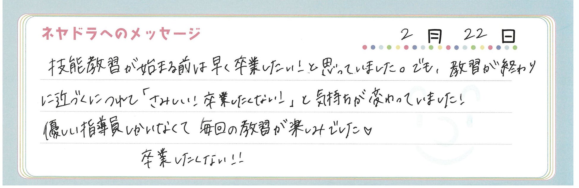 免許は早く取りたいが、卒業が寂しいと感じるほど楽しい教習所であることがわかった。