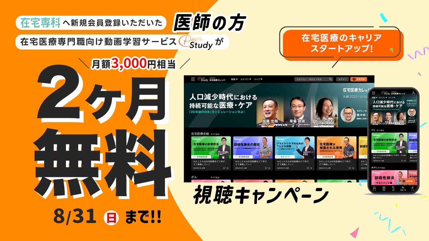 在宅専科へ新規登録いただいた医師の方へ、在宅医療専門職向け動画学習サービス「Peer Study」を2ヶ月間無料でご提供します。(医師個人:月額3,000円相当)※2025/6/30時点
