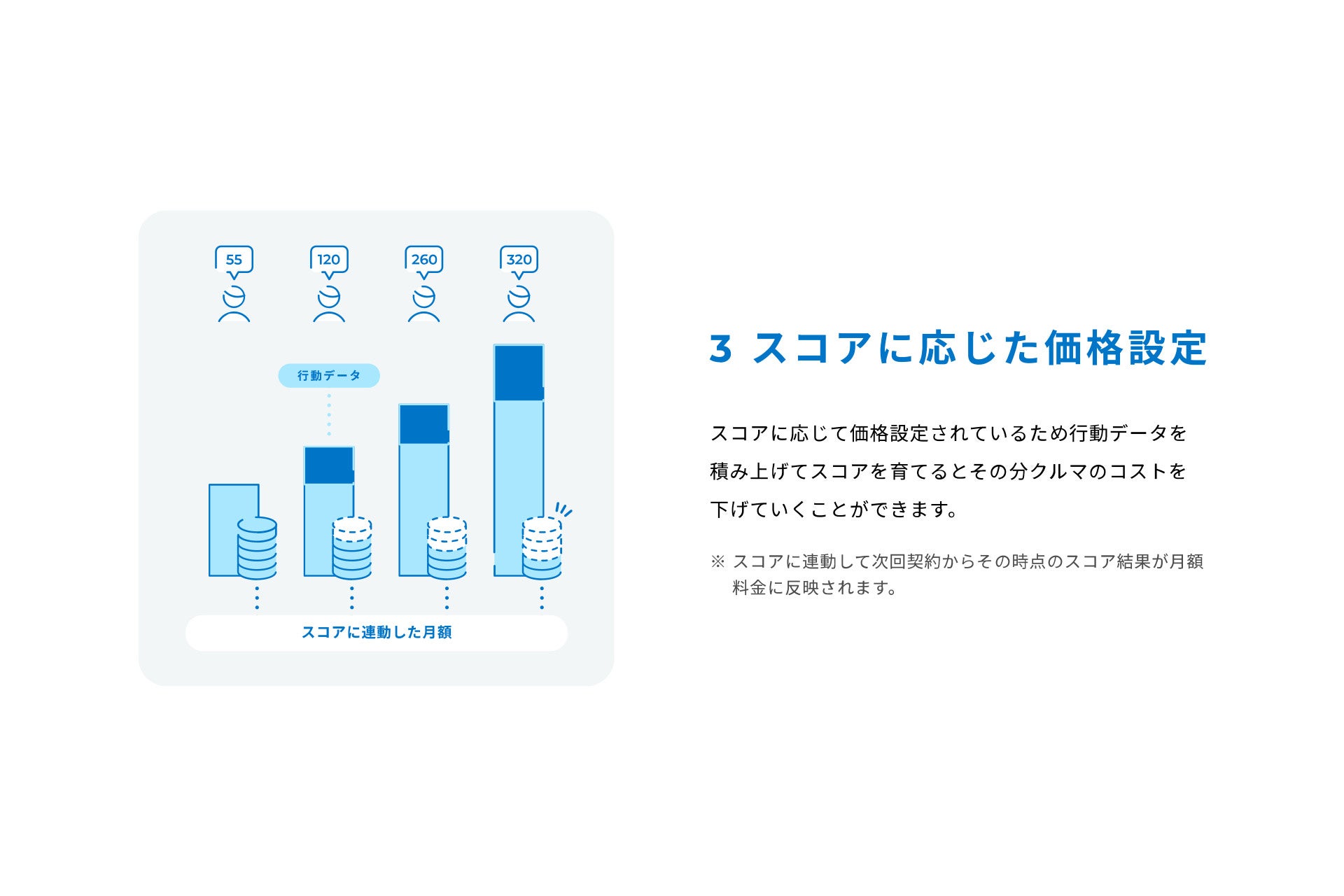 スコアが上がれば月額料金に反映される、という仕組みを説明するビジュアルを配置。