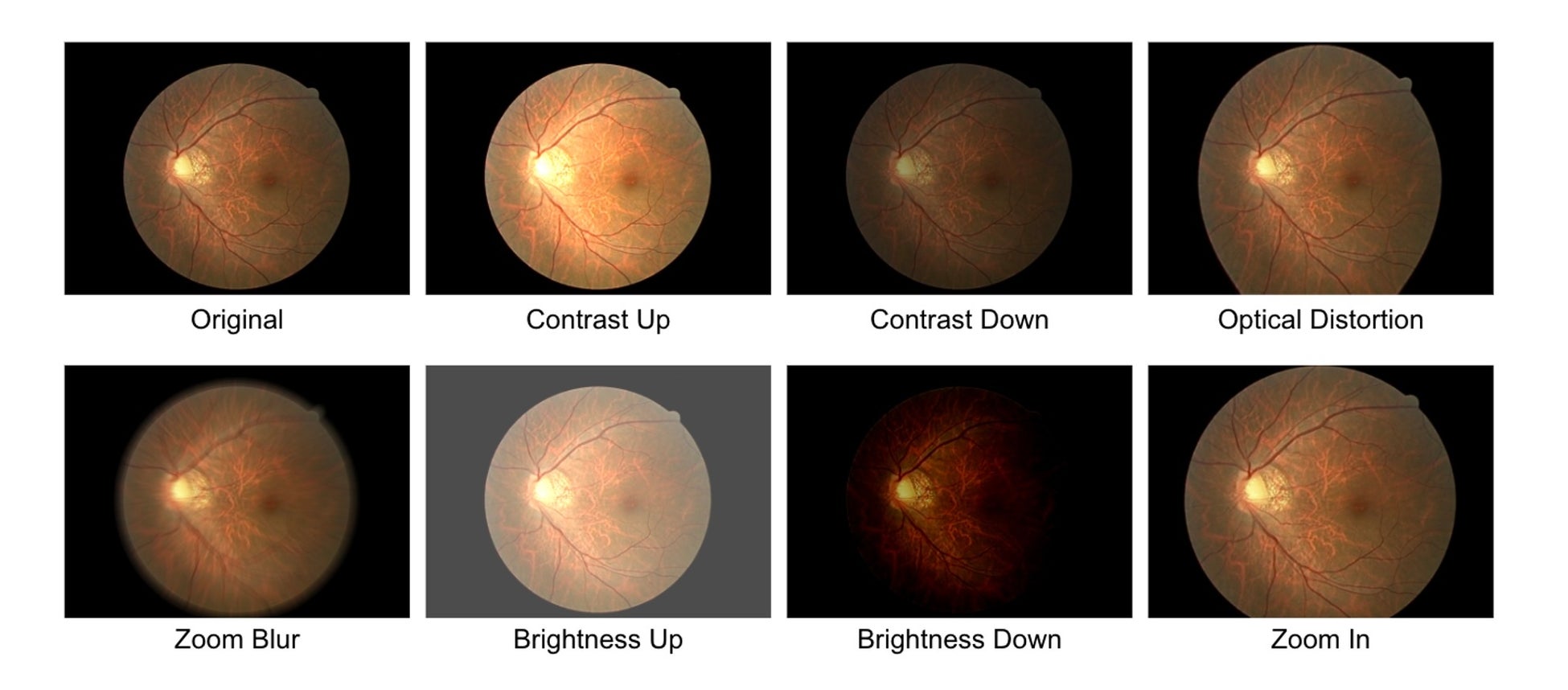 左上がオリジナルの眼底画像で、以降順に、コントラストを上げる処理、コントラストを下げる処理、ディストーション、ズームぼかし、明度を上げる処理、明度を下げる処理、眼底部分をズームインする処理、を加えたものです。