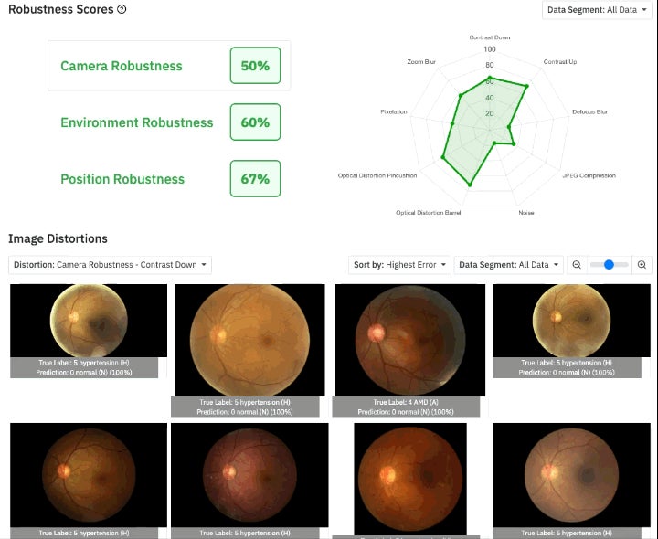 Citadel Lens にて評価した結果、DeepEyeVisionが当初開発したオリジナルのAIモデルは、特にBrightness Down(明度の低い画像)の項目でスコアが低く、つまり、眼底画像の推論は、明度の低さに対する影響を強く受けるということが分かりました。そこで次に、外乱として、眼底画像の明度をランダムに変える処理を施したデータを追加してモデルを学習させるということを行いました。