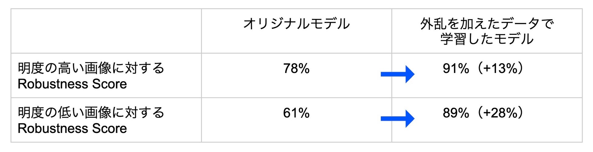 その結果を下表にまとめます。オリジナルのモデルと、眼底画像の明度を変える外乱を加えたデータを学習させたモデルのロバストネス特性を比較したものです。外乱を加えた場合の方が、明度の変化に対するロバストネス特性が高くなることが確認できました。つまり、モデルが明度の変化に対する頑強性を獲得したということになります。