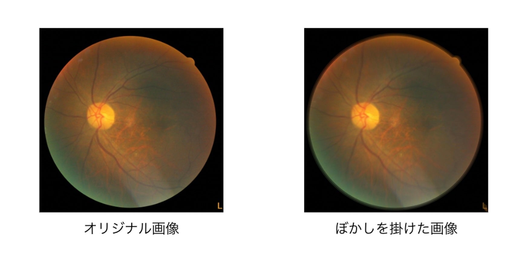 DeepEyeVisionは、AIに入力される眼底画像に加わる外乱(眼底カメラの撮影環境や画像処理に伴うノイズ)が、AIの予測に及ぼす影響について着目し、Citadel AIとの共同研究に着手いたしました。例えば、以下の左の眼底画像には黄斑変性という病変が見られます。AIは、オリジナルの画像については正しく分類できましたが、この画像にぼかしを掛けると、AIは正しく推論できず、疾患が無いと判断してしまいました。このような画像の微妙な変化は、眼底カメラの内部の撮像の変化や、外部の撮影環境の変化によって、臨床現場でも起こり得るものです。