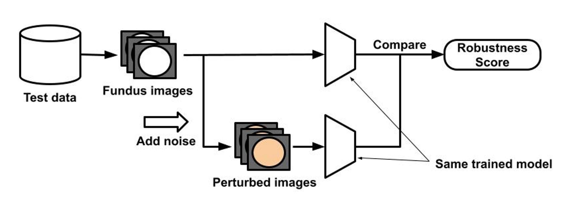 次に、こうして外乱を加えた眼底画像を、モデルに入力します。その出力結果とオリジナルの眼底画像の出力結果を比較します。
