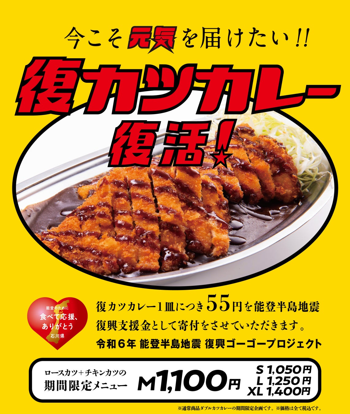 「復カツカレー」は、2011年の東日本大震災で被災した東北の復興を支援する特別メニューで、ロースカツカレーにチキンカツをのせた“複数のカツ”と被災からの“復活”を応援する意味で「復カツカレー」として販売し、売上の一部を寄付しました。今回、「復カツカレー」を10年ぶりに復活させ、一皿につき55円を「石川県令和6年能登半島地震災害義援金」に寄付します。