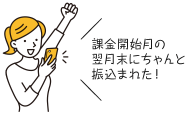 当社では、課金開始月の翌月末(最短1ヵ月)をめどに指定口座へお振り込みいたします(例:課金開始月が1月なら2月末振込)。