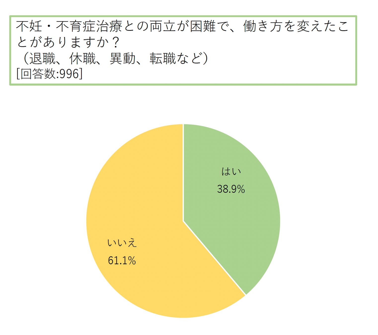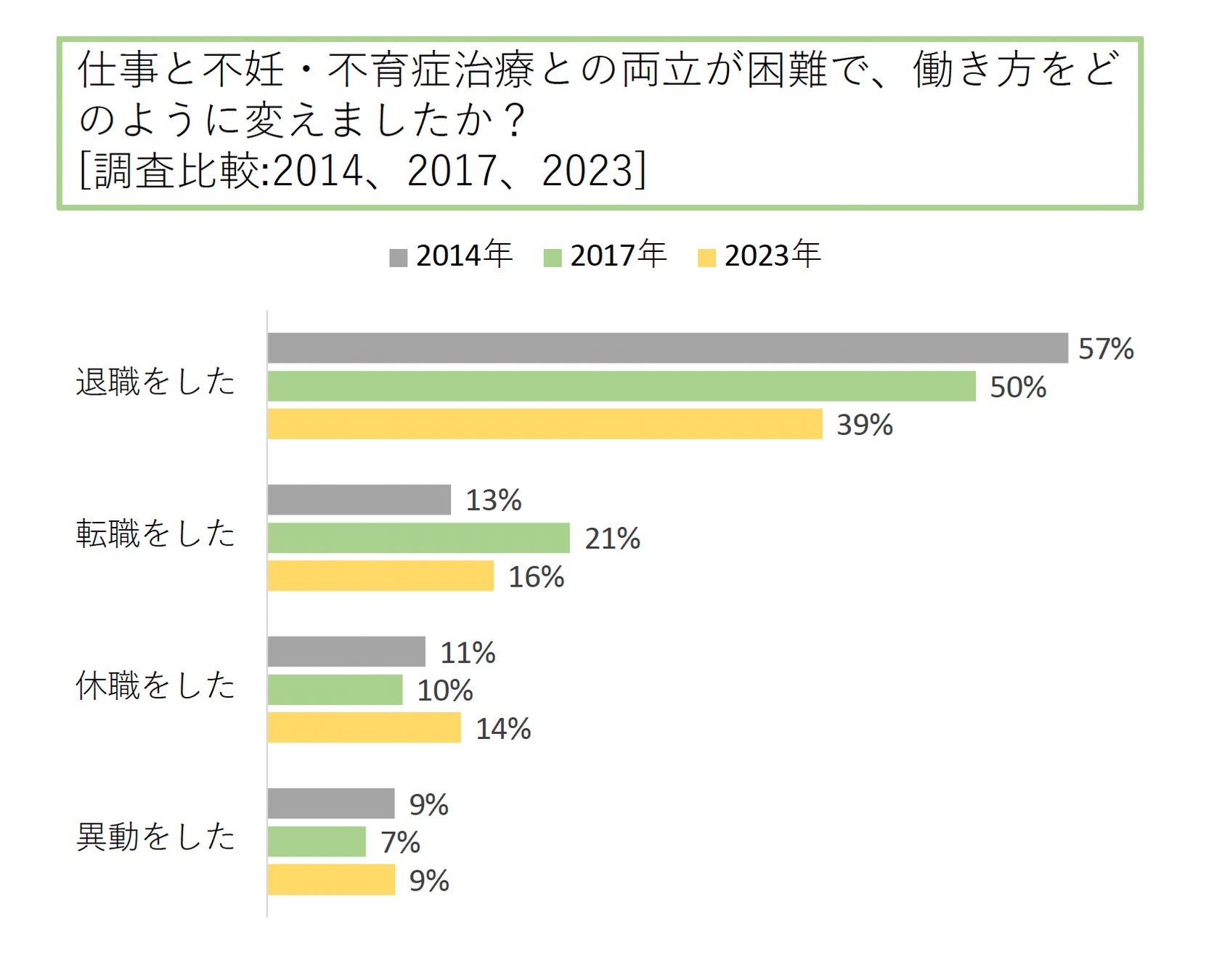 2018年の調査では、不妊治療と仕事の両立に悩み、結果的に退職を選んだ当事者が5人に1人でしたが、2023年の調査では若干の改善傾向が確認されたものの、いまだに不妊退職を余儀なくされる事例があることが明らかになりました。